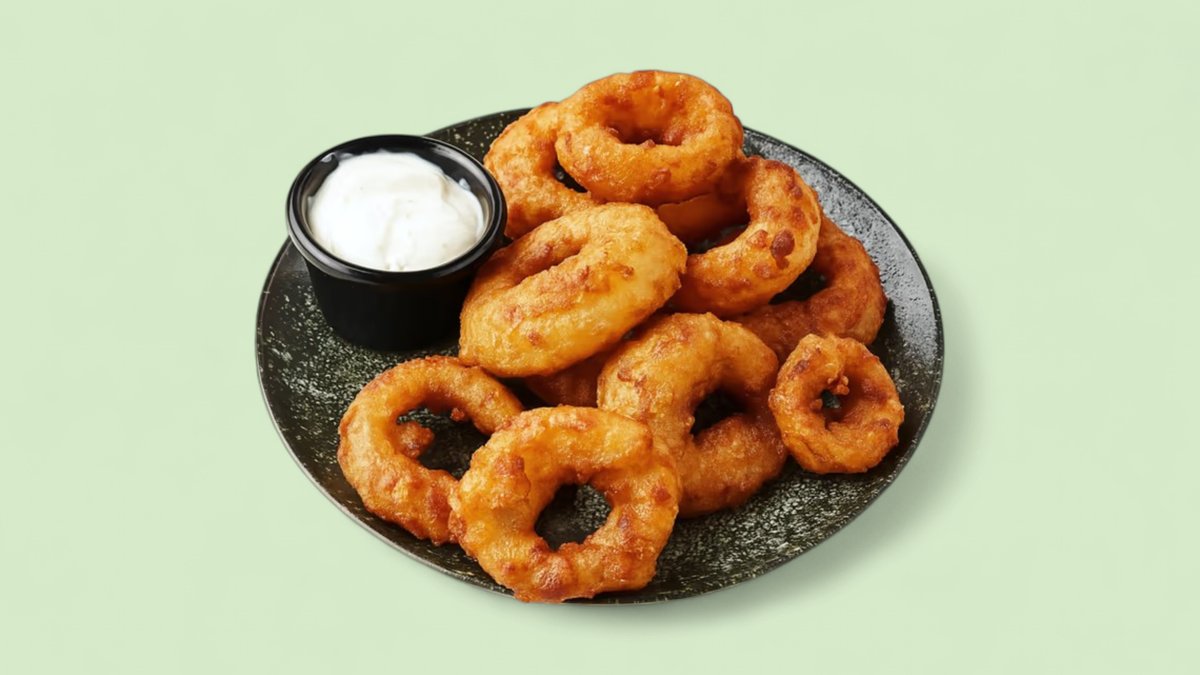 saftige Zwiebelringe in knuspriger Panade, serviert mit Sour Cream