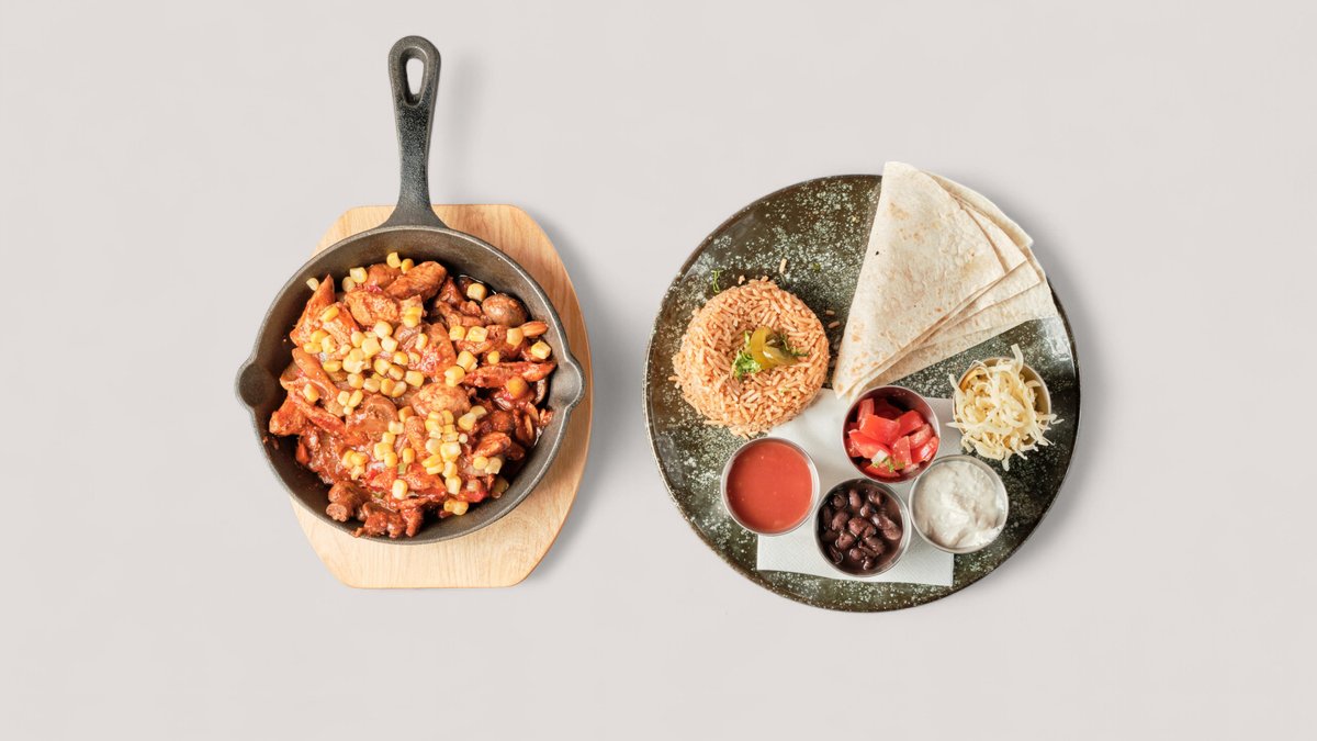 alle Fajitas werden mit gegrillter Paprika, Zwiebeln, Champignons, Mais, mexikanischem Reis, schwarzen Bohnen, Pico de Gallo, Salat, Käse, Sour Cream, Salsa Roja und 4 warmen Weizentortillas serviert