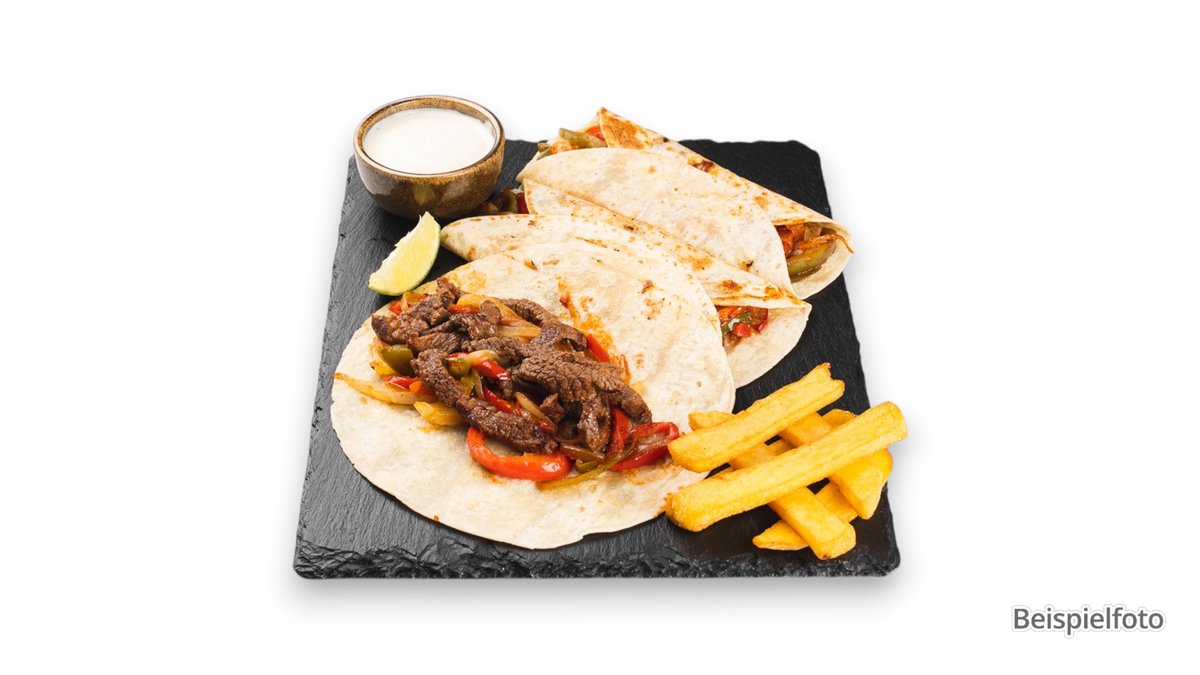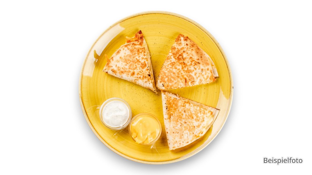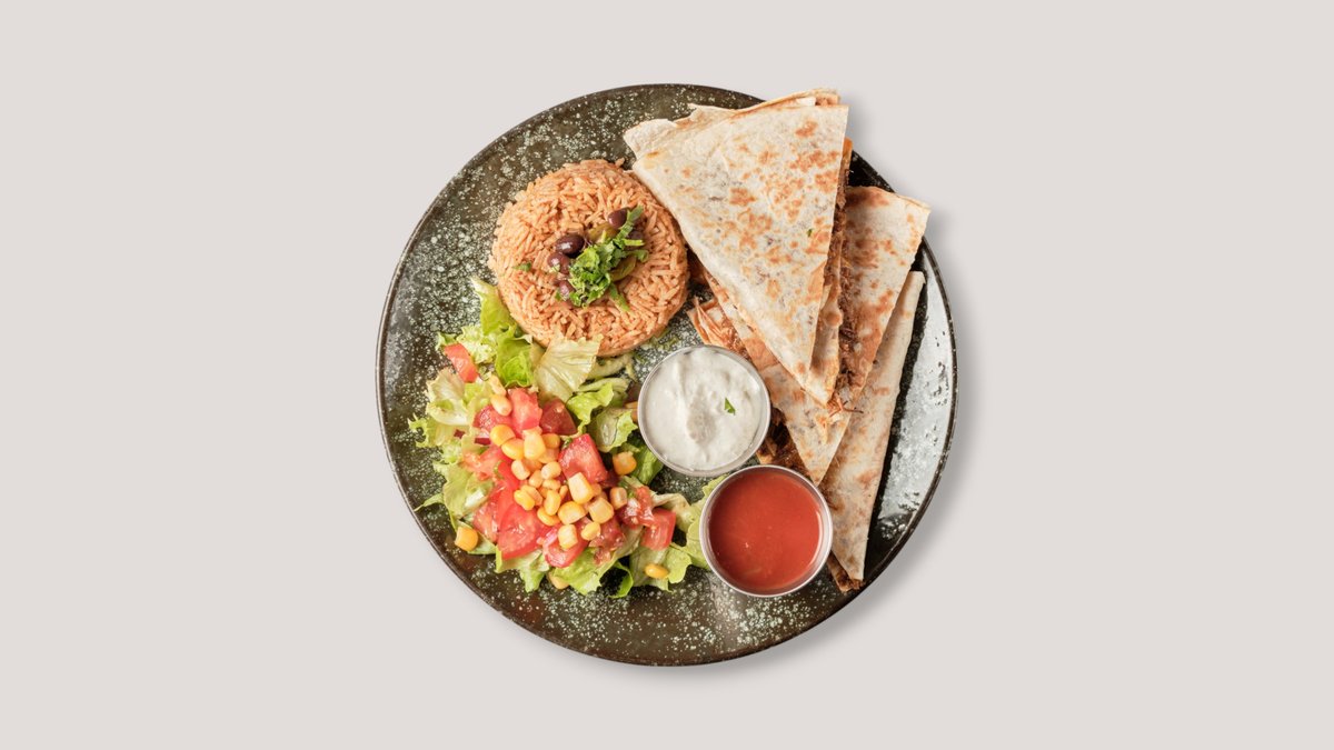 ca. Ø 30 cm weiche Weizenmehl-Tortilla mit gegrilltem Cheddar-Mozzarella, mexikanischem Reis, kleinem Beilagensalat, Sour Cream, Salsa Roja und einer Füllung deiner Wahl