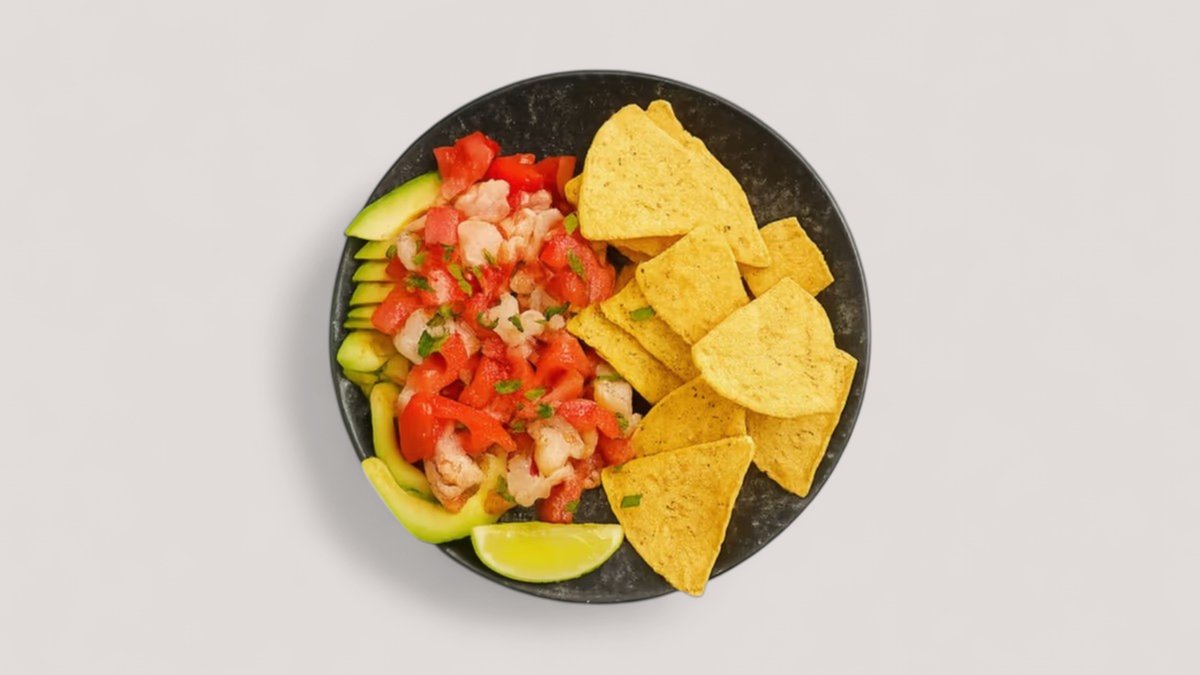frischer Fisch in Limettensaft mit Pico de Gallo, serviert in einer halben Avocado, dazu Nachos