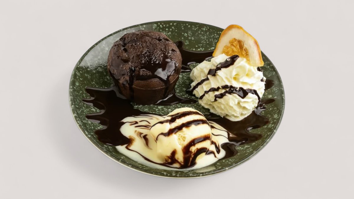 Schokoladenkuchen mit flüssigem Kern, serviert mit Vanillesoße und Sahne Das Gericht wurde mit Schokolade zubereitet und kann Spuren von verschiedenen Nüssen enthalten