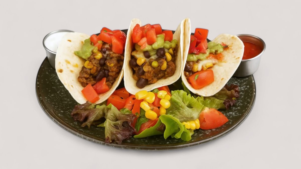 3 Stück mit schwarzen Bohnen, Pico de Gallo, Avocado, rosa Zwiebeln, Cheddar-Mozzarella, Nachos, Salat, Sour Cream, Salsa Roja, einer Basis und einer Füllung deiner Wahl