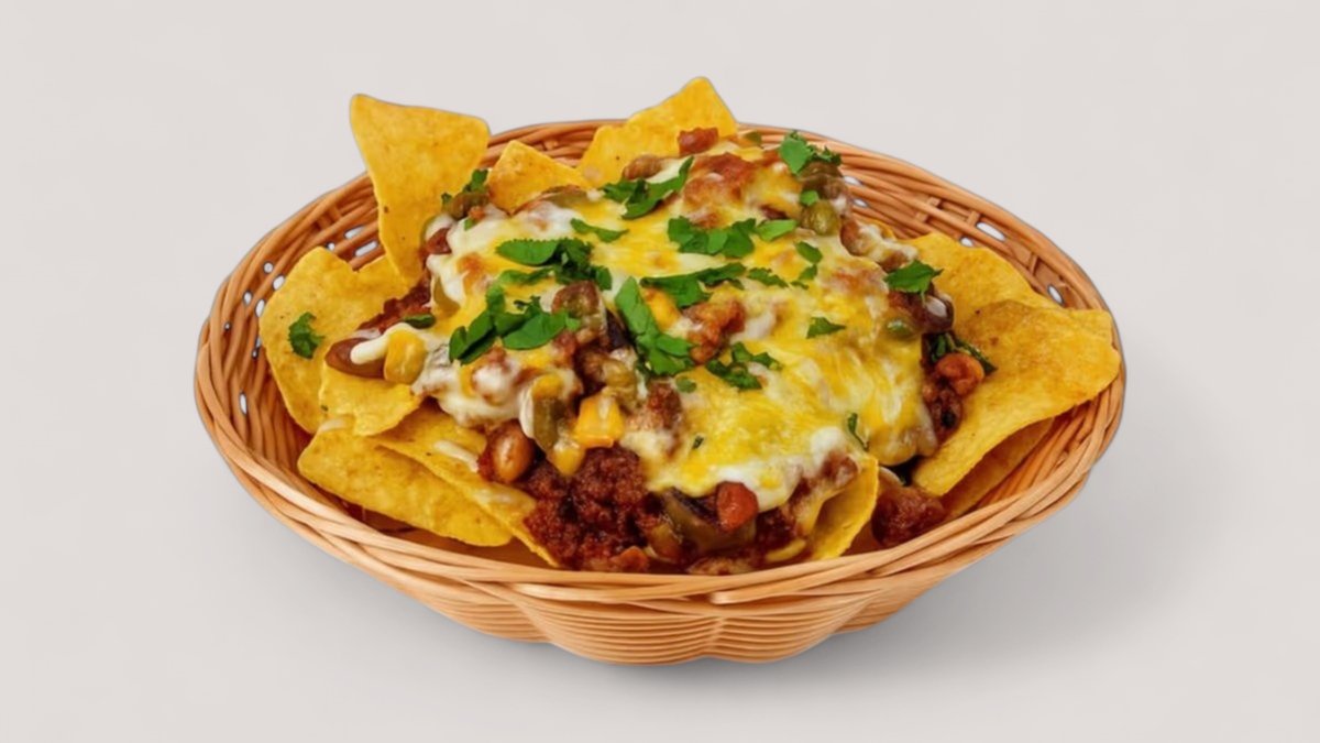 Tortilla Chips mit Cheddar-Mozzarella überbacken, veganem Chili-Tofu und Koriander