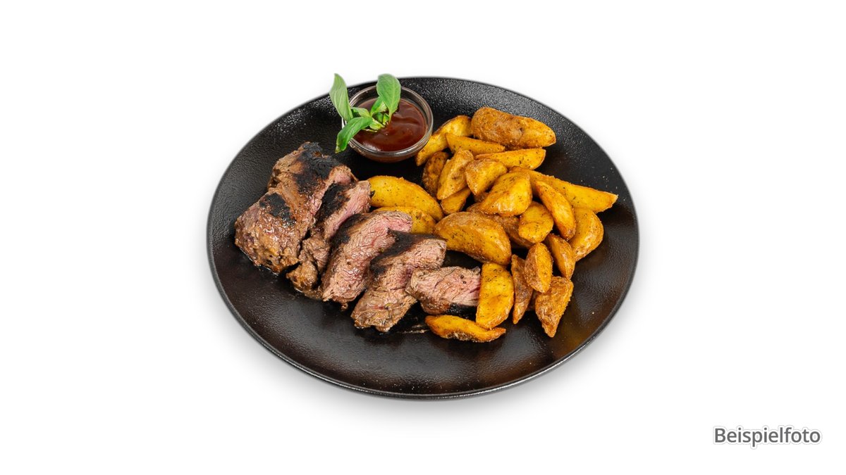 ca. 250 g saftiges gegrilltes Steak mit gebratenen Pimientos, Champignons, Tomaten und einer Beilage deiner Wahl