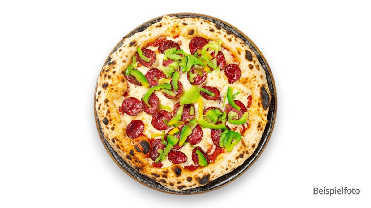 mit Rindersalami, Paprika, Zwiebeln und scharfer Peperoni