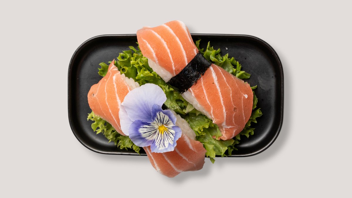 Sushi-Reis zu Nigiri geformt, obenbrauf veganer Lachs