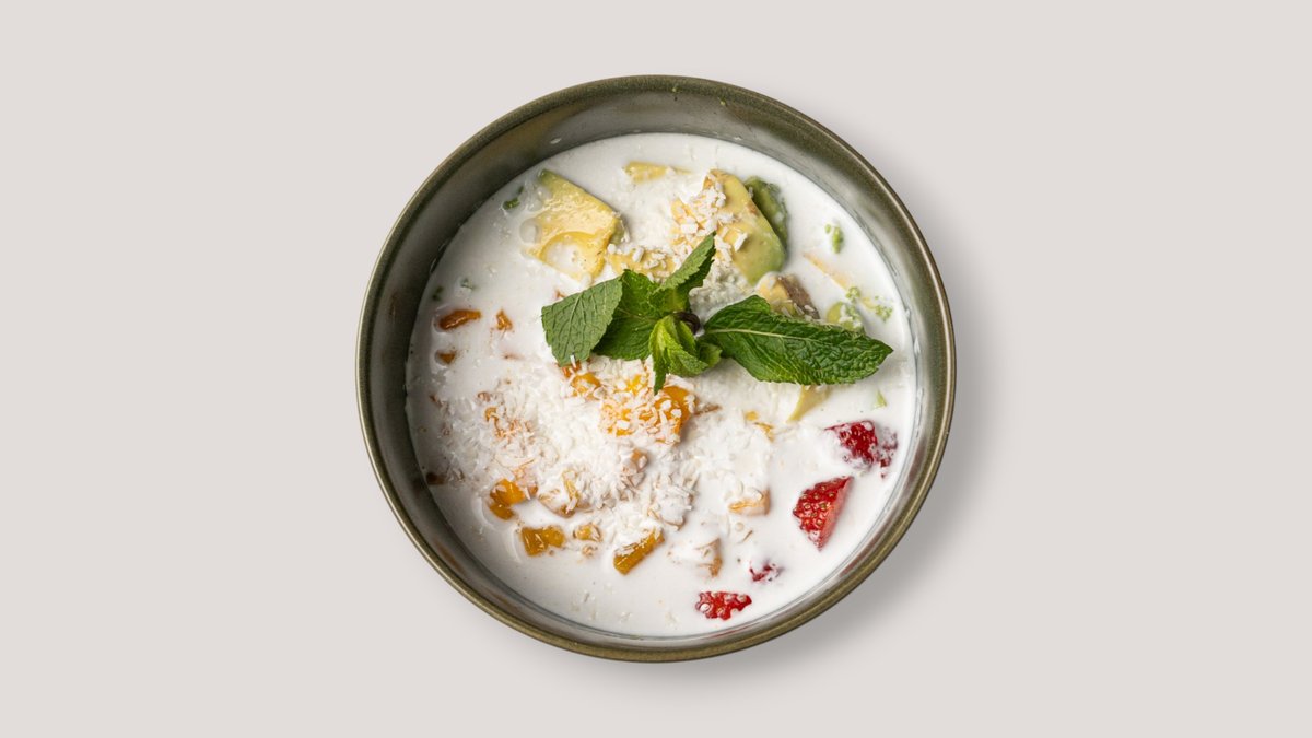 Harmonie aus Mango, Avocado, Erdbeeren und hausgemachter Kokoscreme