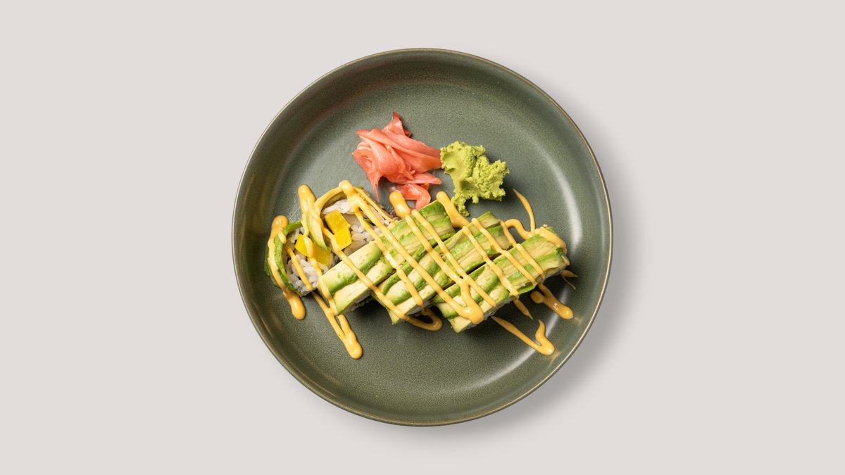 auĂźen mit knuspriger Tempura-Mantel und innen mit Gurken, Avocado, eingelegtem Rettich und Mango