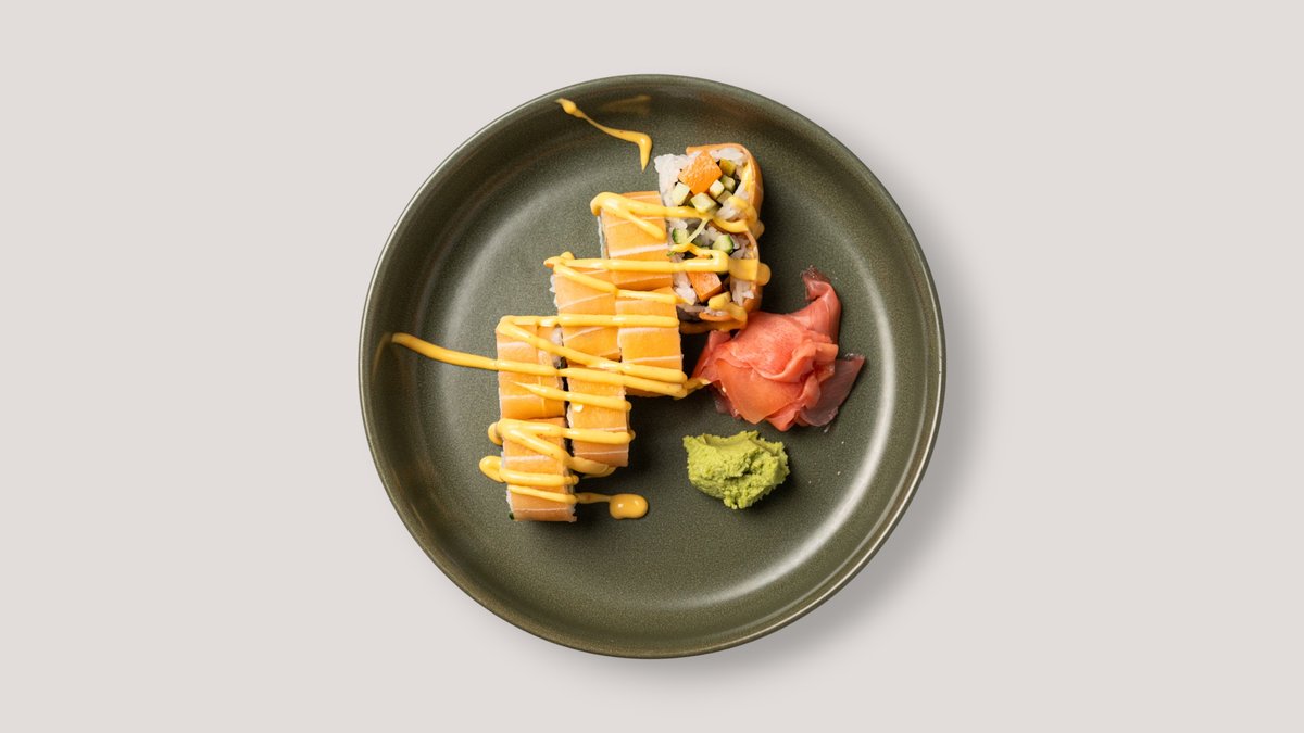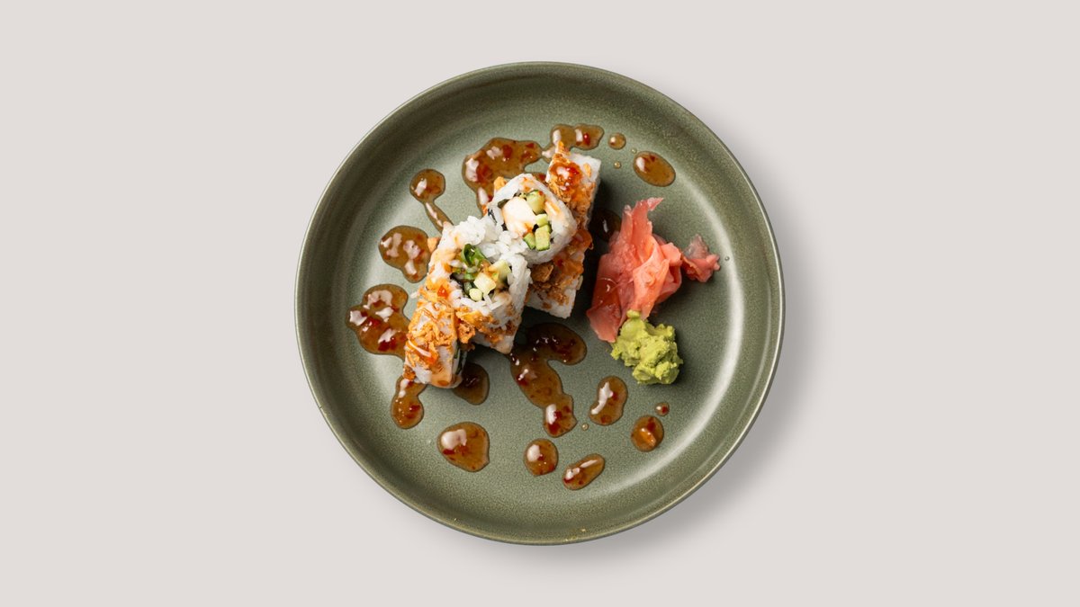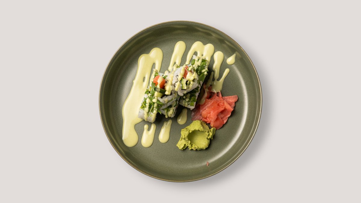 auĂźen mit knuspriger Tempura-Mantel und innen mit veganem Lachs, Avocado und Lauchzwiebeln