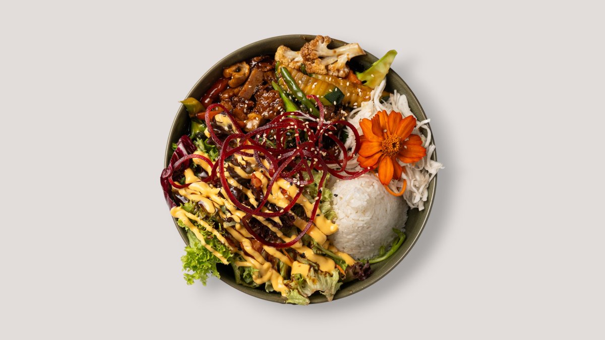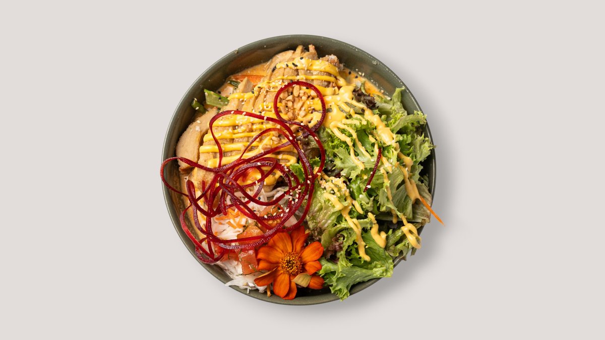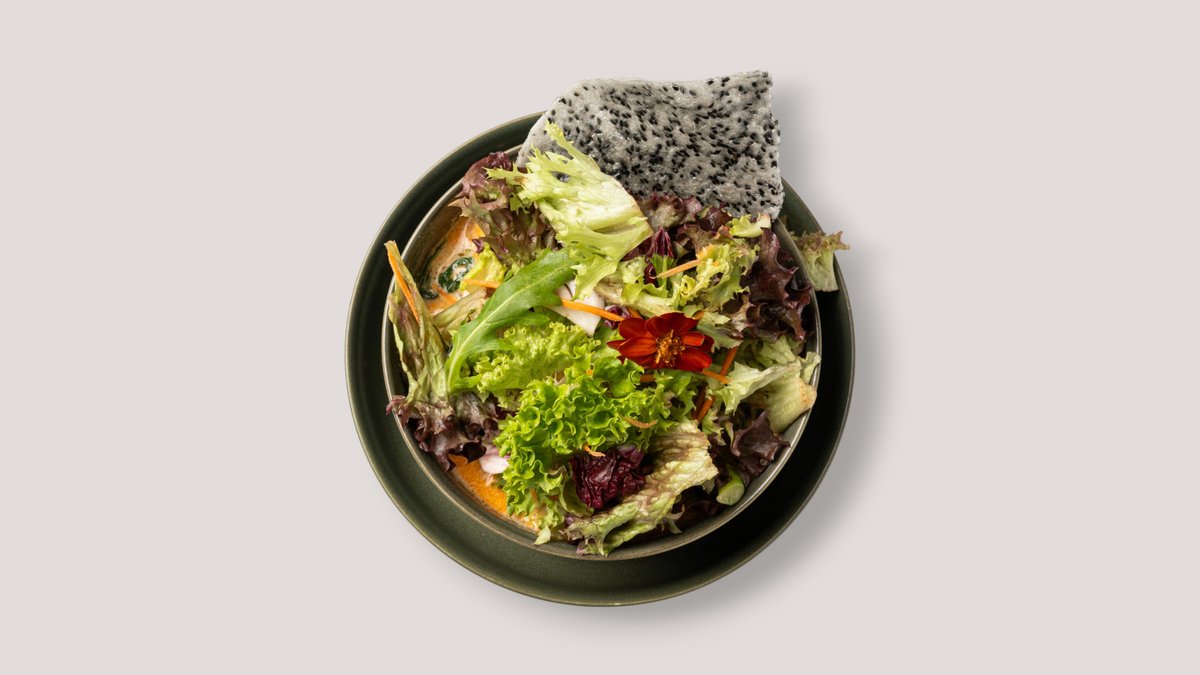 mit Seitan-Hähnchen, saisonalem Gemüse, hausgemachter roter Curry-Kokossoße, garniert mit Erdnüssen, Sesam und gemischtem Salat