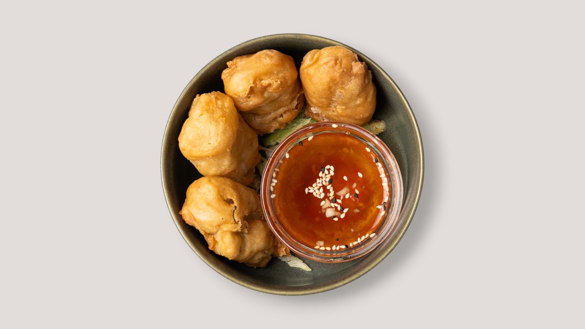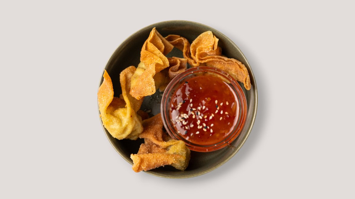 4 StĂĽck gebackene hausgemachte Wantanteigtaschen mit Sweet Chili Sauce