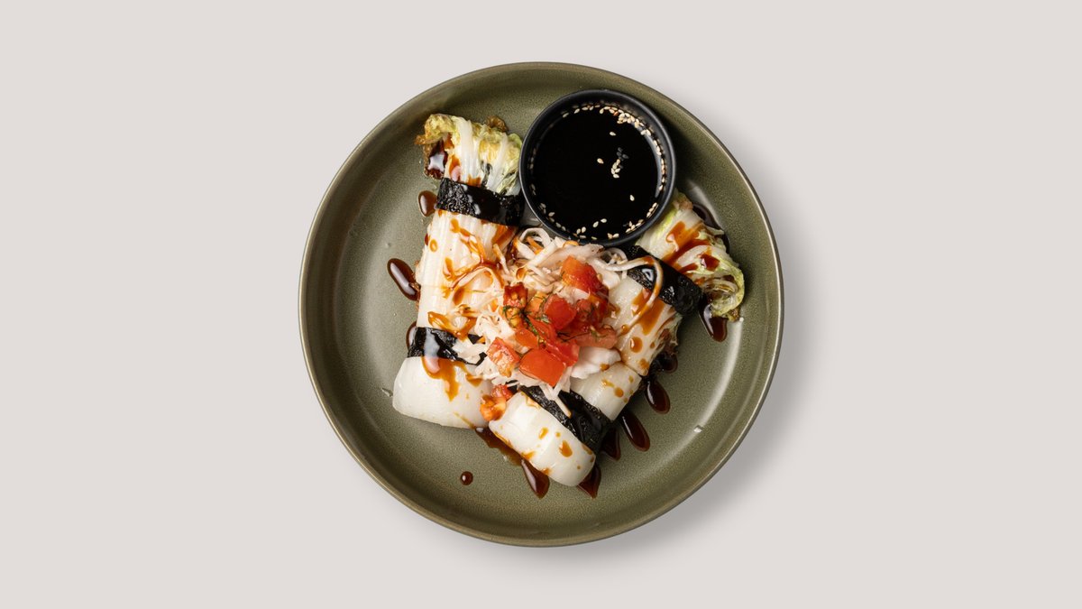 2 Stück goldgebackene Tofustreifen ummantelt von Chinakohlblättern, übergossen mit Unagisoße und hausgemachtem Soja-Dip
