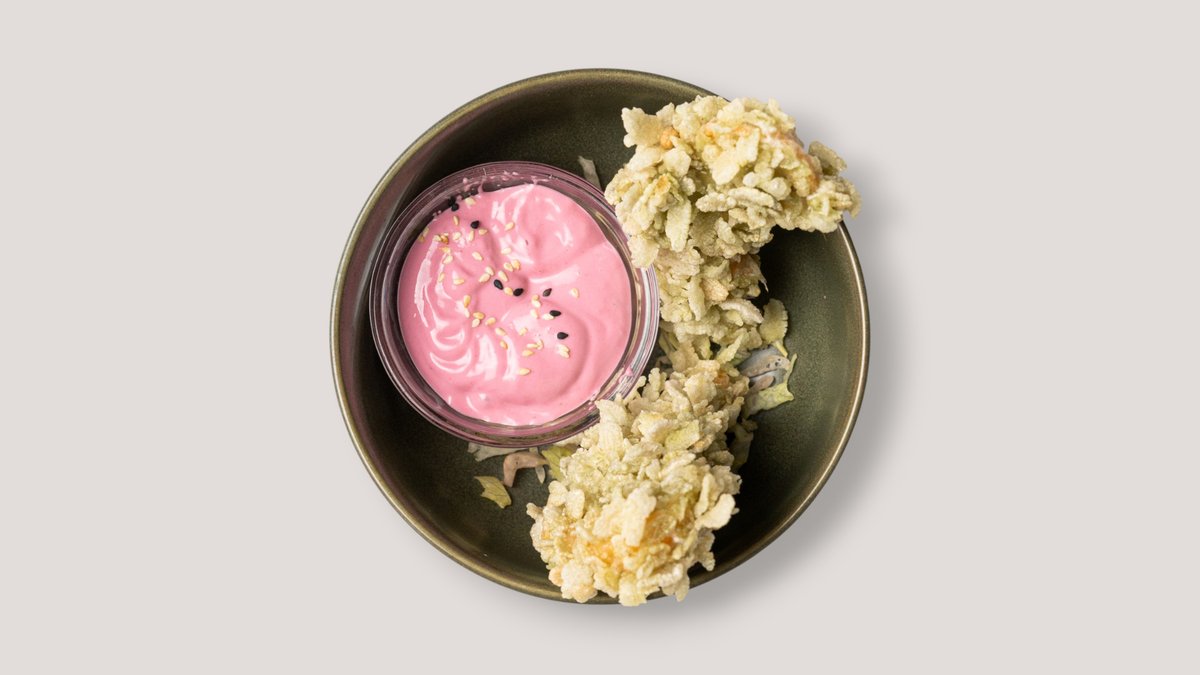 vegane Garnele ummantelt mit knusprigen grĂĽnen Reisflocken mit Erdbeer-Chili-Dip
