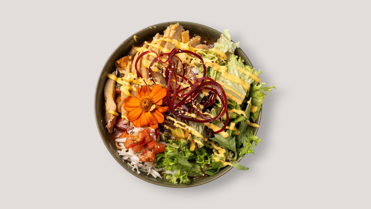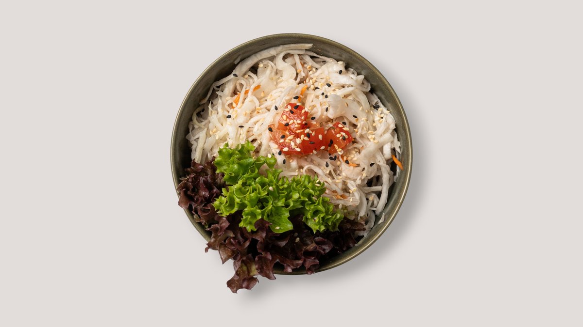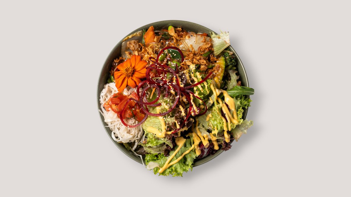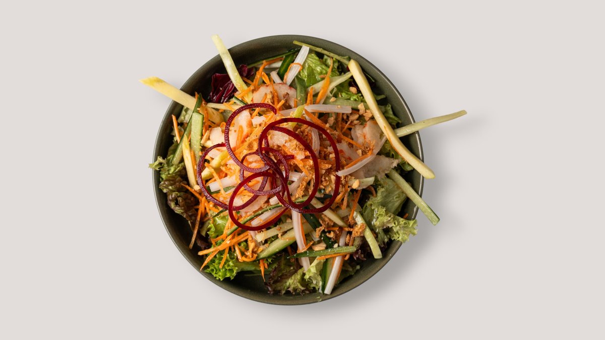 mit frischer Mango, Lotusstängel, veganen Garnelen, Karotten, Gurken, Röstzwiebeln und Erdnüsse, verfeinert mit einem hausgemachtem Dressing