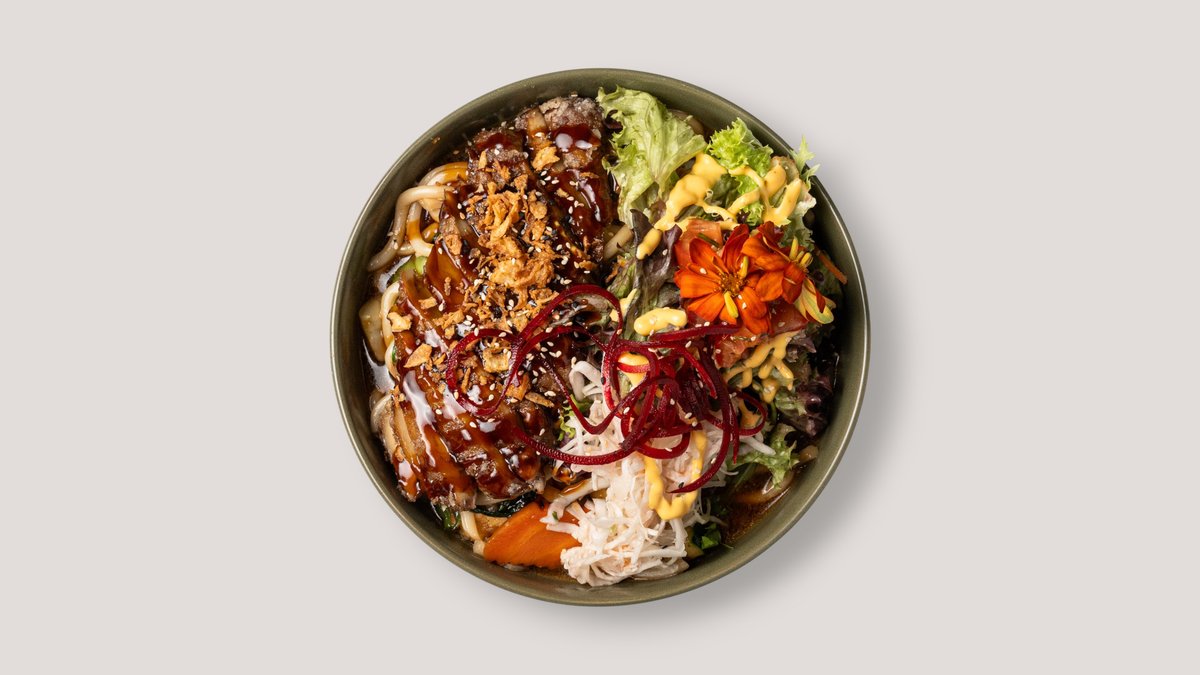 Seitan-Ente mit gebratenen Udonnudeln, saisonalem Gemüse und würziger Shitakesoße, garniert mit Röstzwiebeln, Sesam und gemischtem Salat