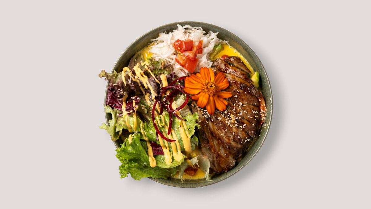 serviert mit grĂĽnem Spargel, hausgemachter Teriyaki-SoĂźe und Tofu, ummantelt mit Seealge mit Sesam und gemischtem Salat