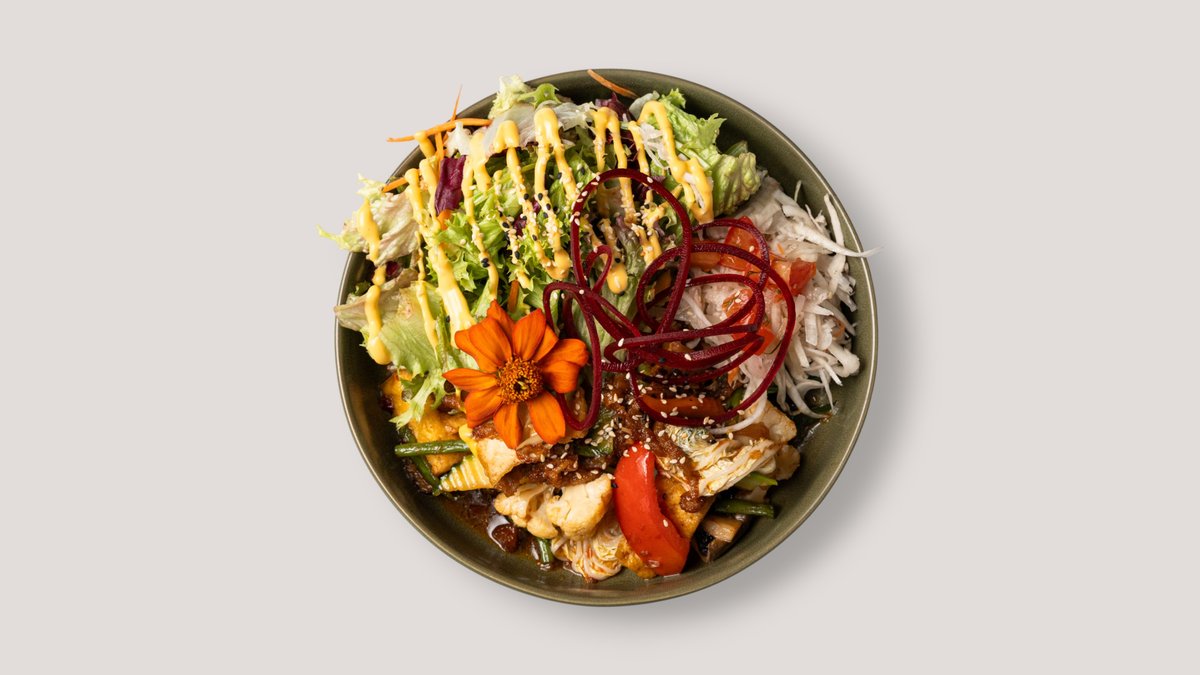 mit gebratenem Tofu, Seitanstreifen, Sojasprossen, Lauch, Zitronengras und Chili serviert mit Reisfadennudeln, garniert mit Röstzwiebeln, Erdnussen und einer süß-sauren Tamarind-Soße, serviert mit Sesam und gemischtem Salat – lauwarme Bowl