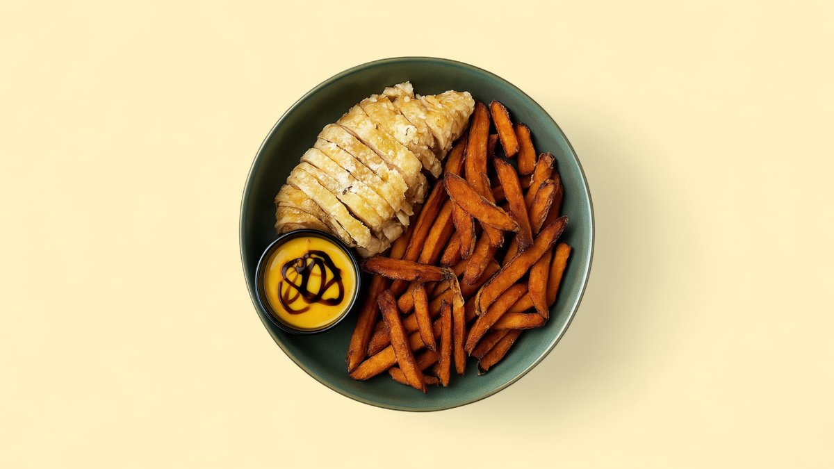 gebackenes Seitan-Hähnchen mit Süßkartoffel-Pommes und Mango-Mayonnaise