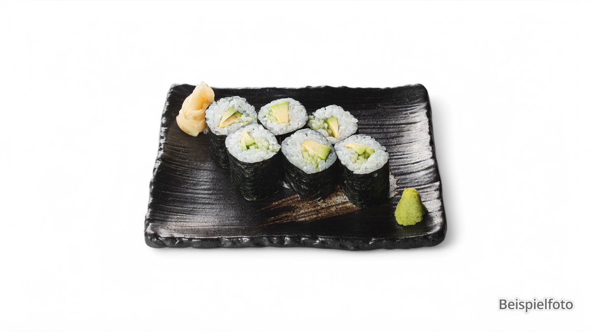 auĂźen mit veganem Thunfisch und innen mit veganen Garnelen, Avocado, eingelegtem Rettich, Lauchzwiebeln und UnagisoĂźe