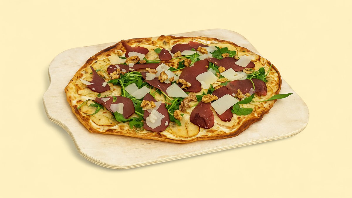 mit Speck vom Schwein, Zwiebeln und Crème fraîche