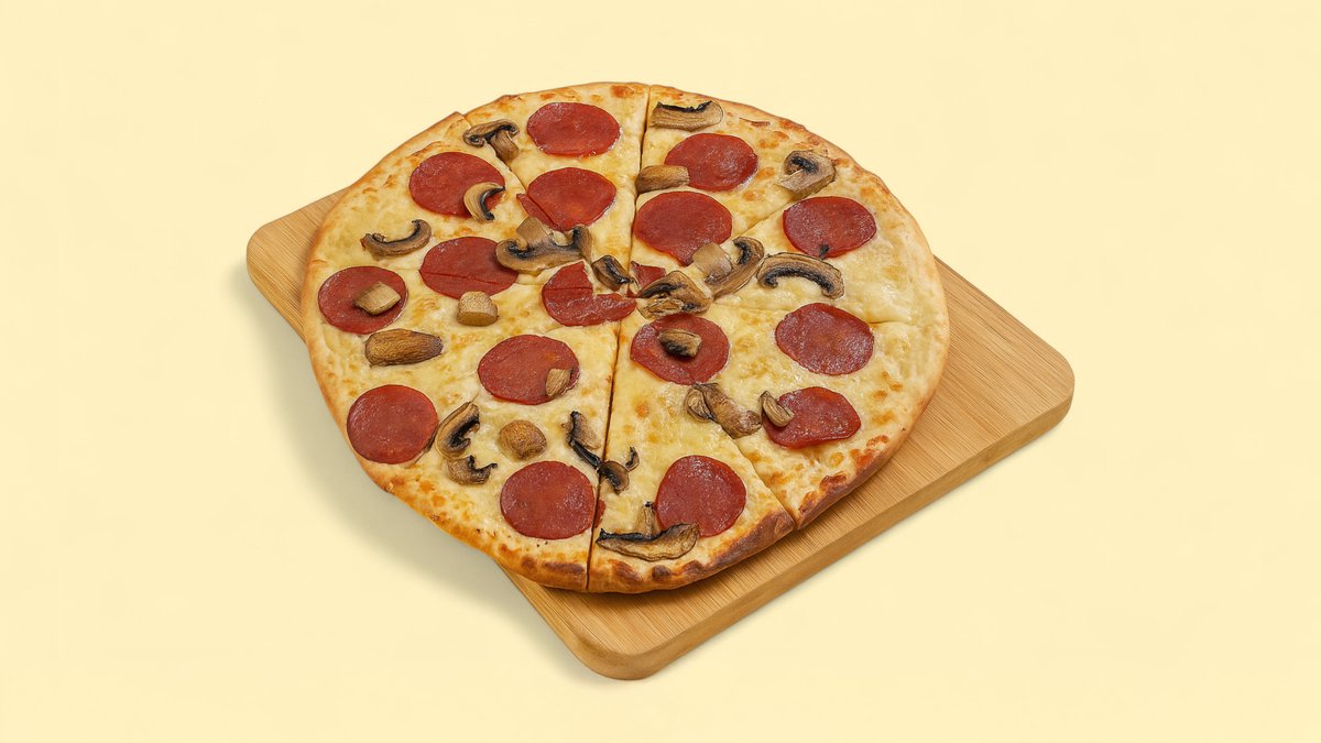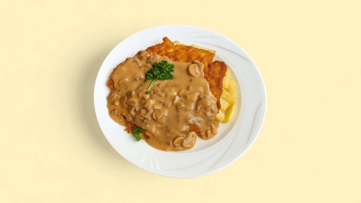 Schweineschnitzel paniert mit Champignon-Rahmsoße, Pommes frites und Salat