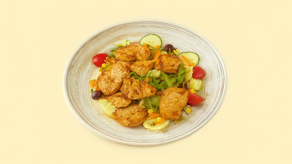 Rindfleisch mit Zwiebeln, Pommes frites und Salat