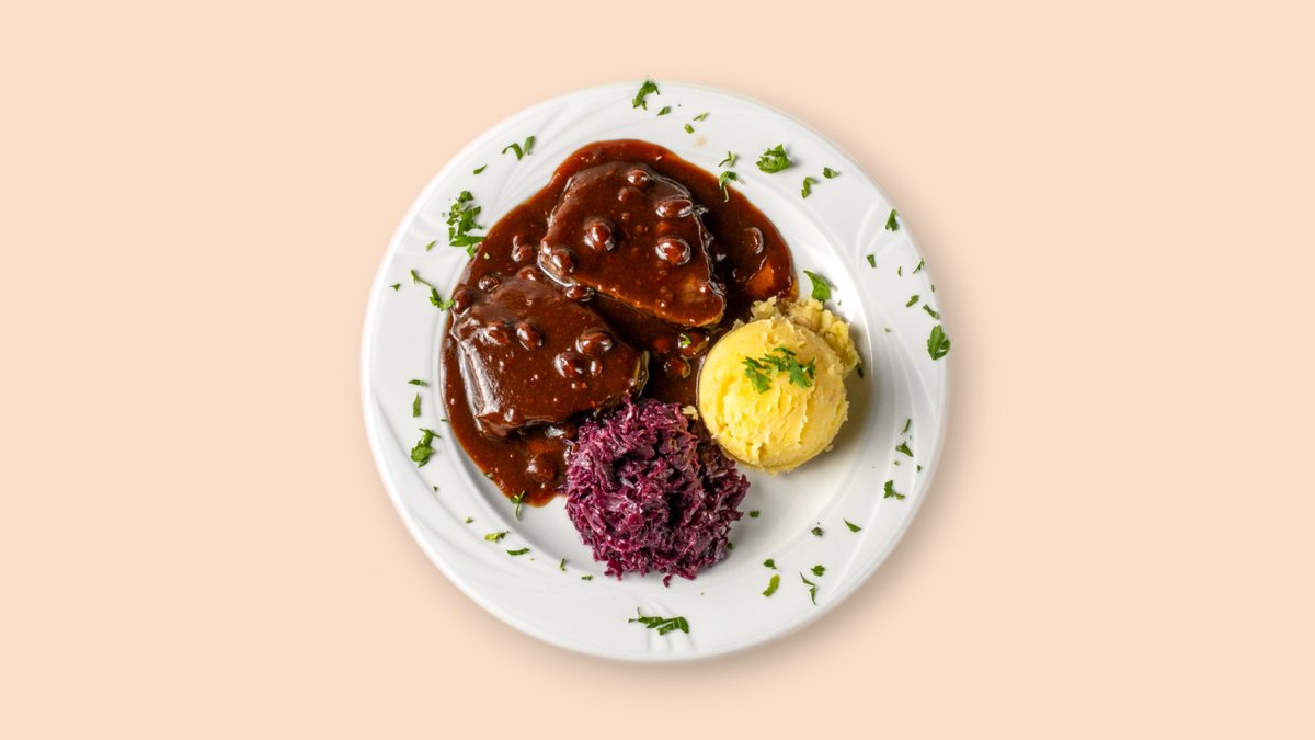 geschmorter Rinderbraten in Rosinensoße, Kartoffelpüree und Rotkohl