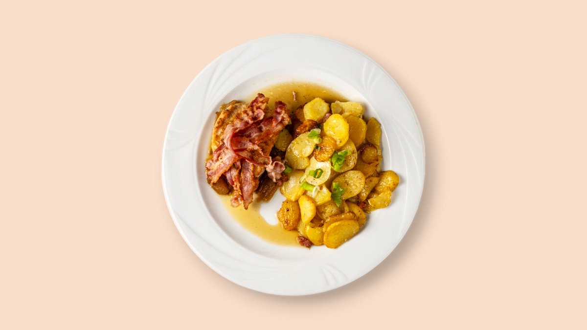 Schweinesteak mit Speck vom Schwein, Zwiebeln, Bratkartoffeln und Salat