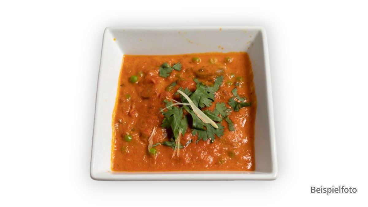 mild indisches Gemüse in einer pikanten Currysoße, dazu Tomaten, Paprika und Zwiebeln