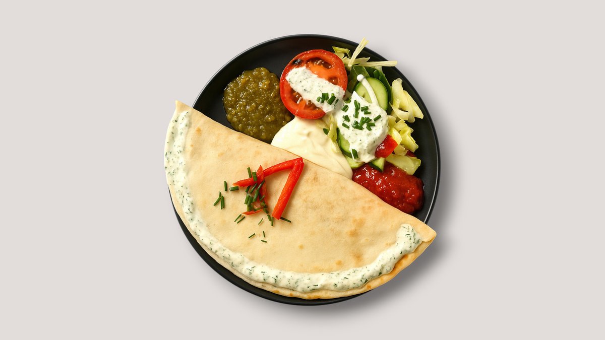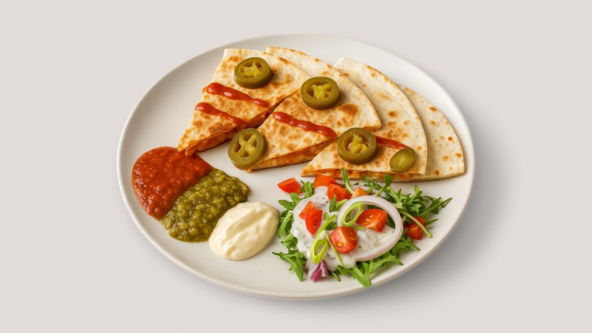jede Portion enthält 2x Weizenfladen, gefüllt mit Käse, Mole, Cheddar-Chili-Soße und einer hausgemachten Füllung, mit Salat, Kräuter-Joghurt-Dressing, roter Salsa, grüner Salsa und Aioli serviert