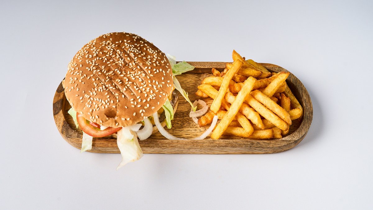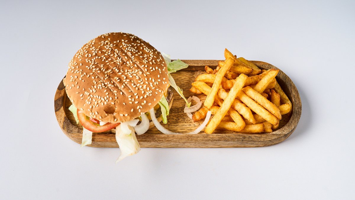 alle Burger werden mit Sesambrötchen, Eisbergsalat, Tomaten, Zwiebeln, Sauergurken und Burgersoße zubereitet