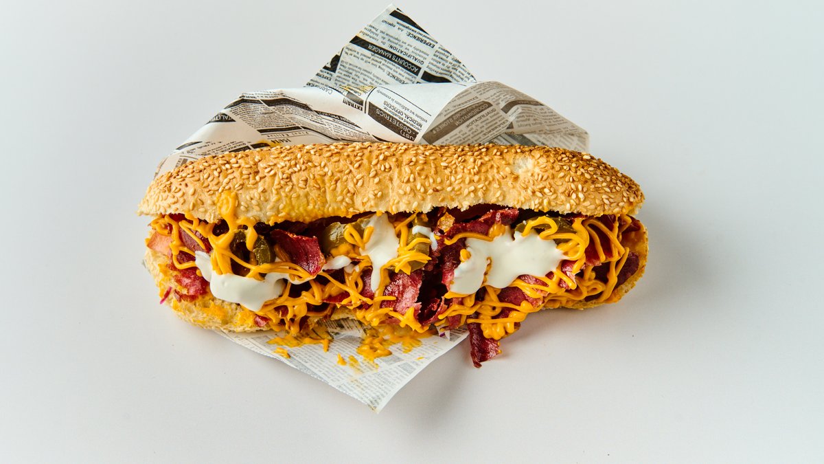 mit Rind, knusprigem Sesam-Baguette, Eisbergsalat und einer Soße deiner Wahl