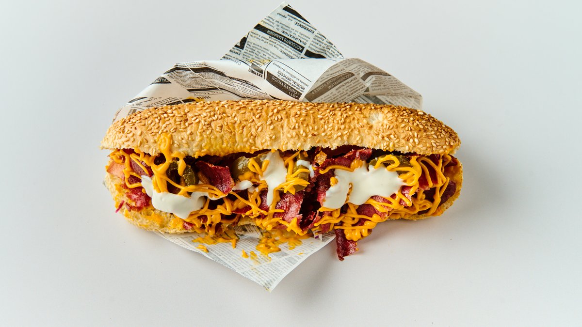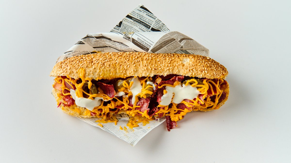 mit Rind, Sesam-Baguette und extra Cheddar-Soße