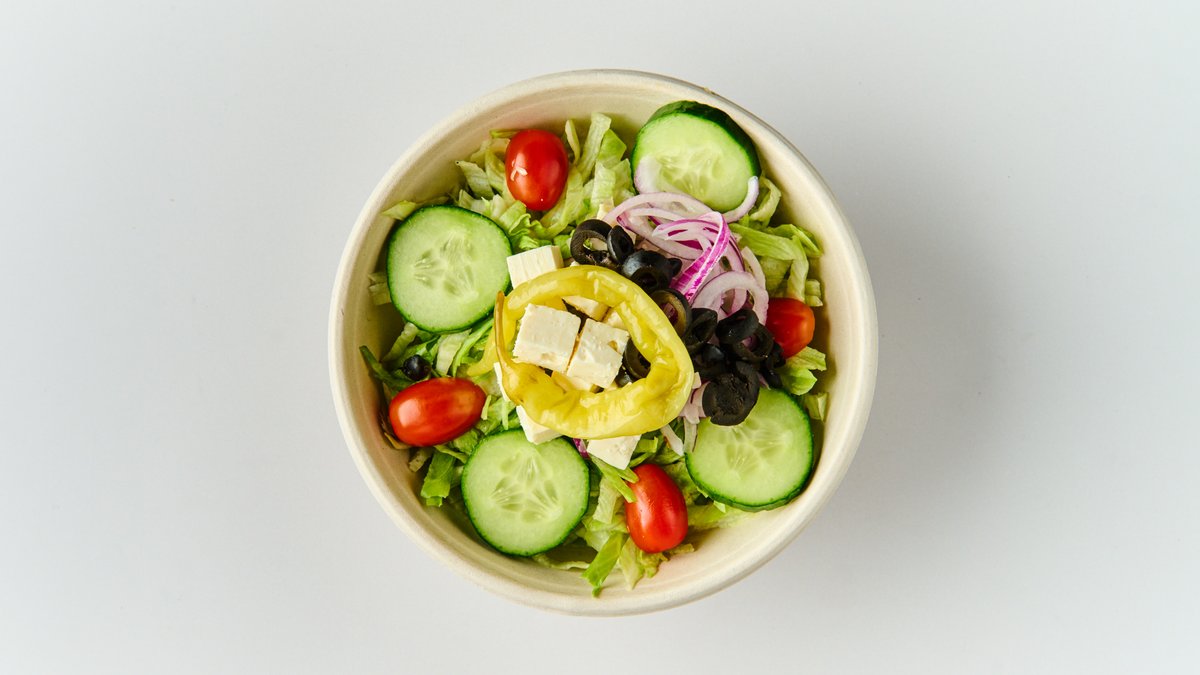 knackig Salat-Mix mit schwarzen Oliven, Gurken, roten Zwiebeln, Pfefferschoten, Hirtenkäse und Joghurt-Dressing