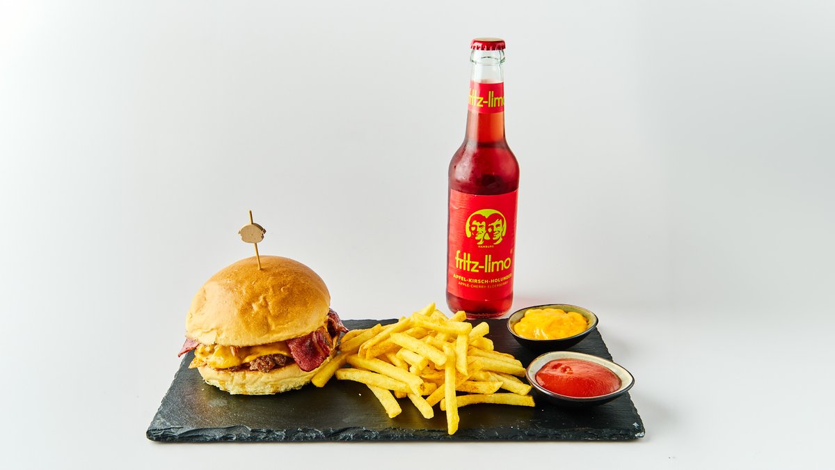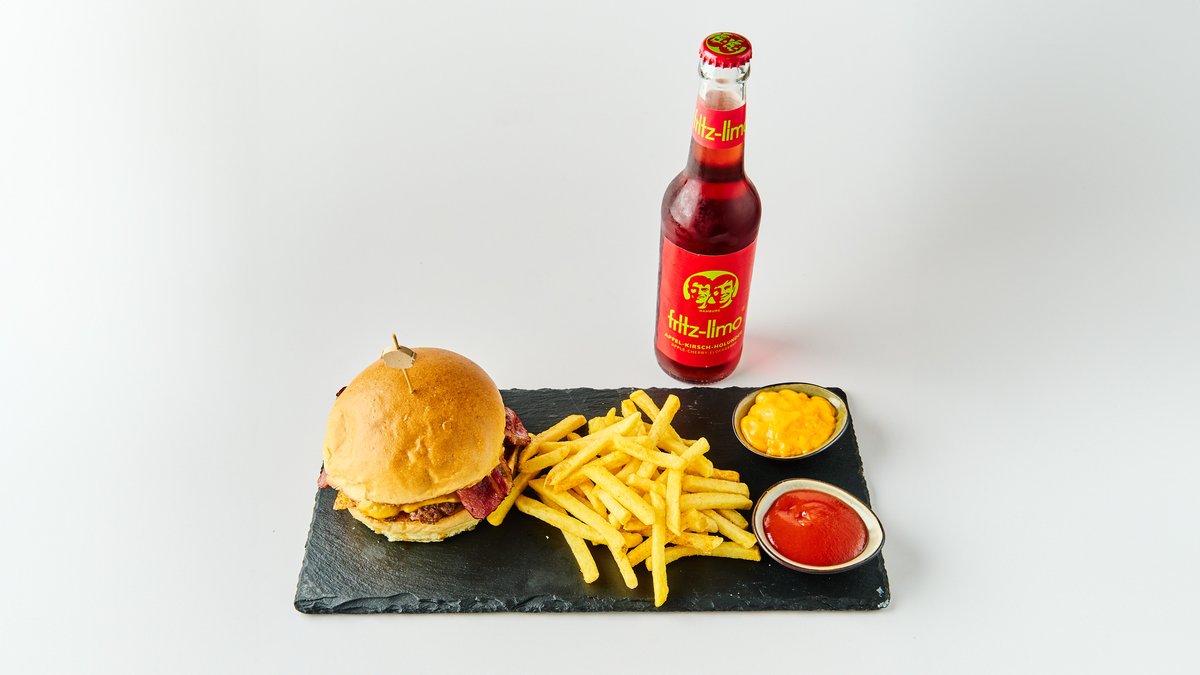alle Burger werden mit Rindfleischpatty, Zwiebeln, Sauergurken, Schnittsalat und hausgemachter Soße zubereitet („Chicken Burger“ wird ohne Rindfleischpatty und Schnittsalat zubereitet)