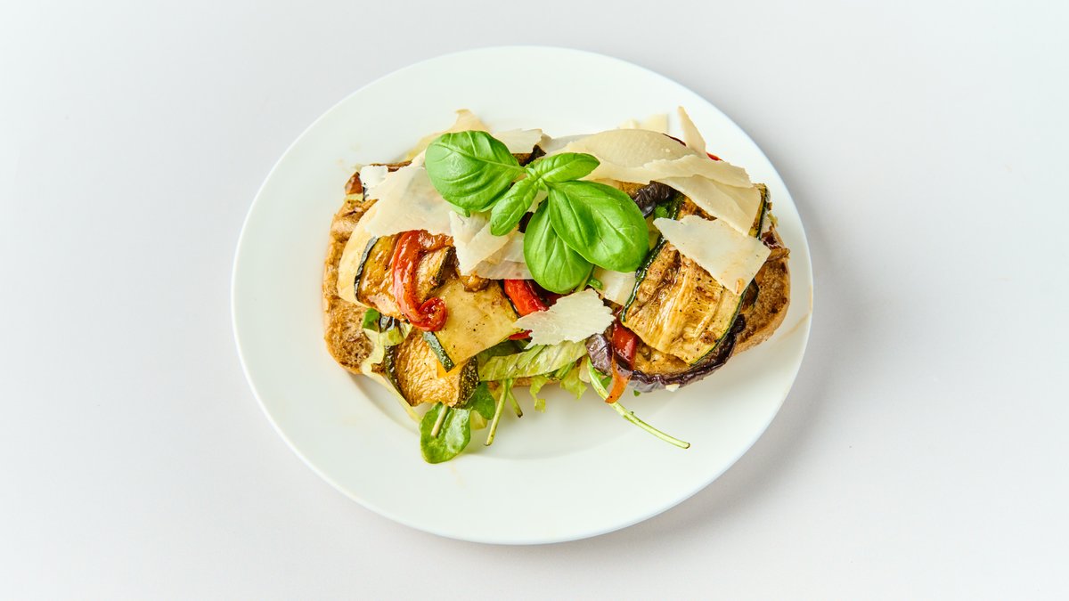 mit gegrilltem Gemüse, Salat, Pesto und Oliven