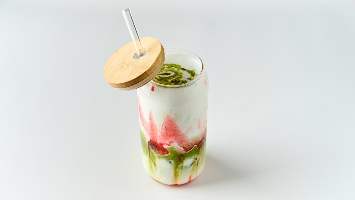 Matcha-Pulver aufgelöst in kalter Milch, auf Eis serviert.
