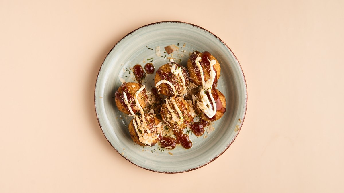 6 Stück Teigtaschen mit Oktopus, außen knusprig, innen saftig, serviert mit Takoyaki-Soße, Bonitoflocken und Aonori