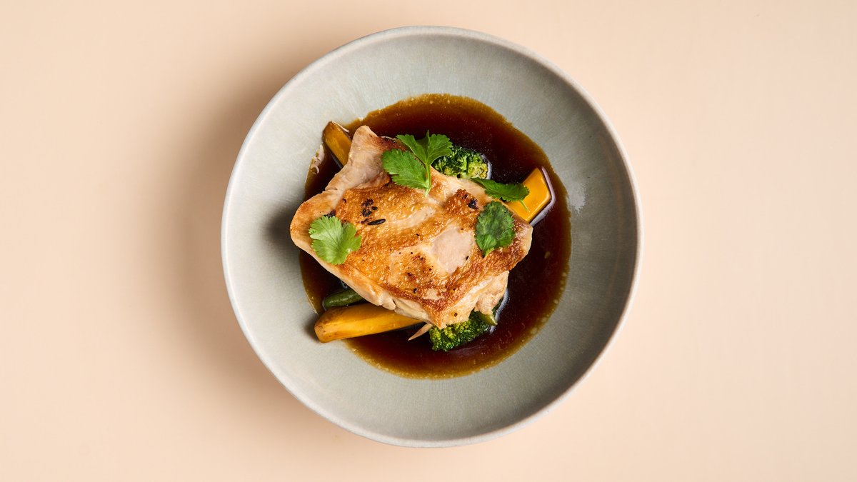 frittiert Hähnchen mit Kirsch-Barbecuesoße, Buchweizen-Popcorn, Togarashi und Dill