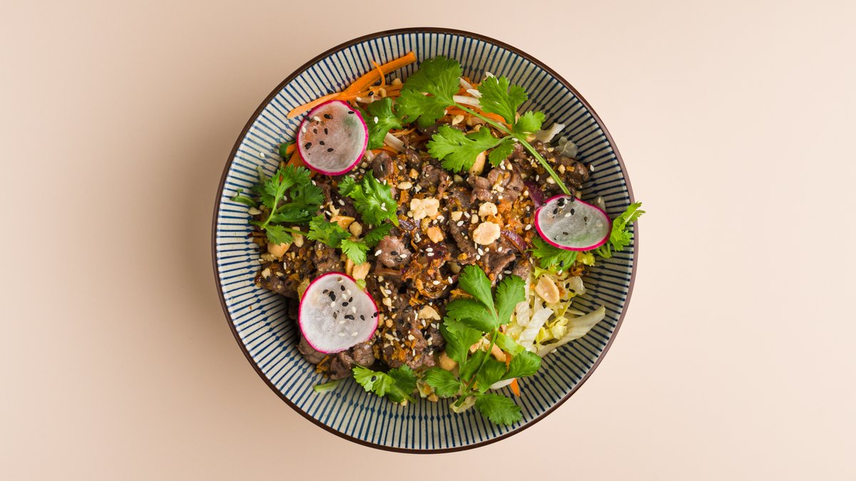 mit gebratenem Rindfleisch, Reisnudeln, Salat, Erdnüssen und hausgemachter Soße