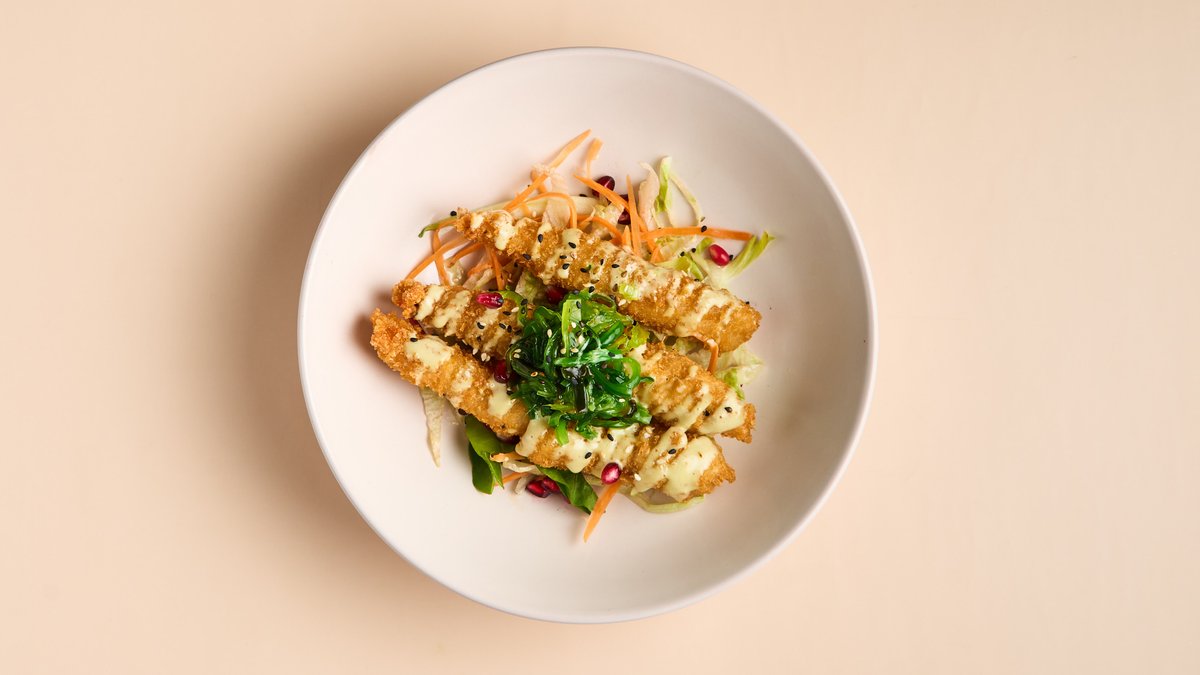 paniert Shrimps mit Wakame, Pak Choi, Karotten und Wasabi-Mayonnaise