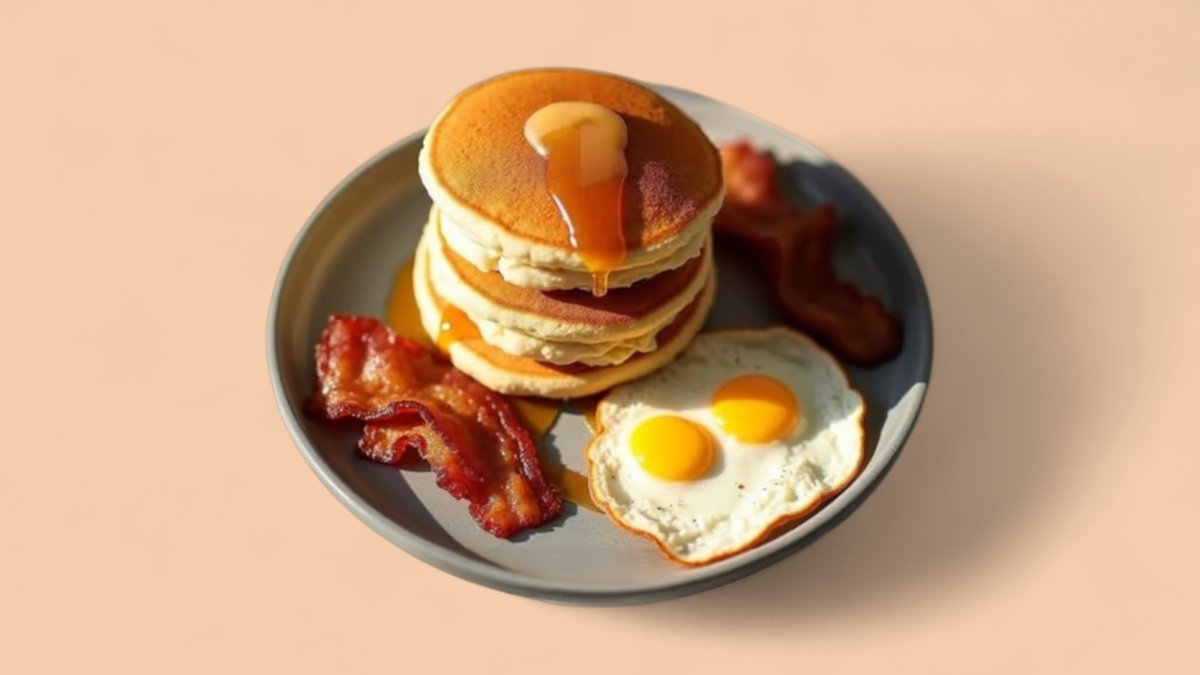 3 Pancakes, 2 Spiegeleier, knuspriger Bacon, hausgem. Noisette-Butter-Sauce mit Ahornsirup