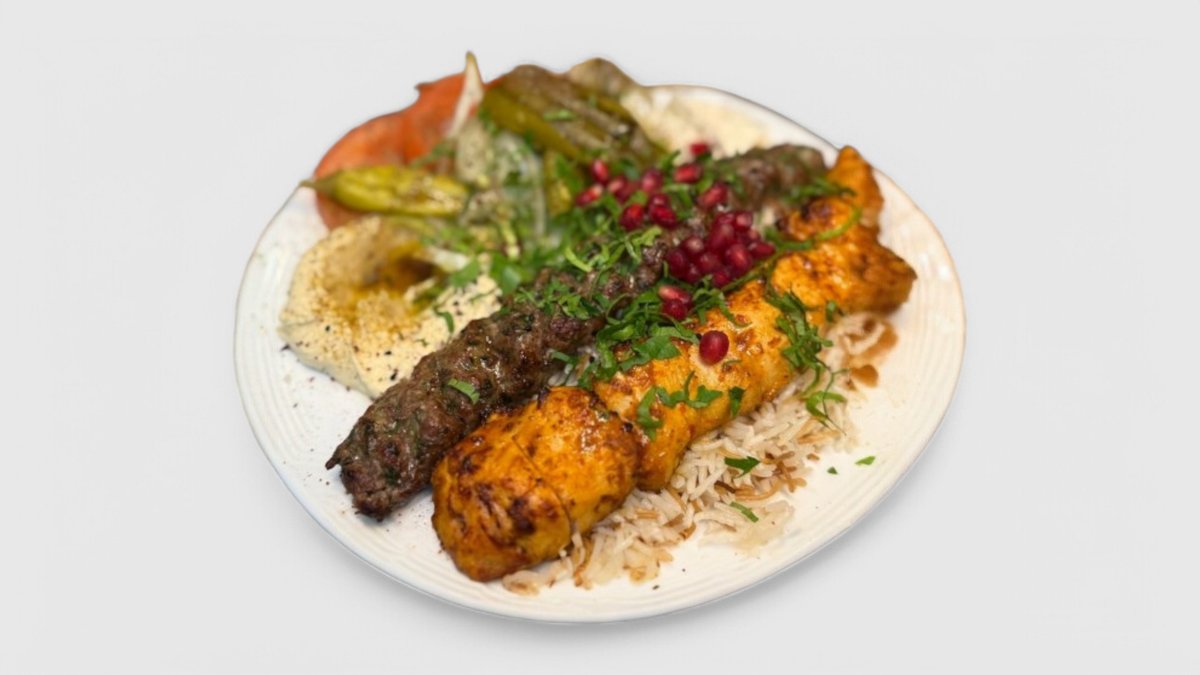 Spies Shish Tawouk(Hähnchen Brust), Spies Kebab Köfte, Hummus , Salat , Brot , Sauce nach Wahl , Reis