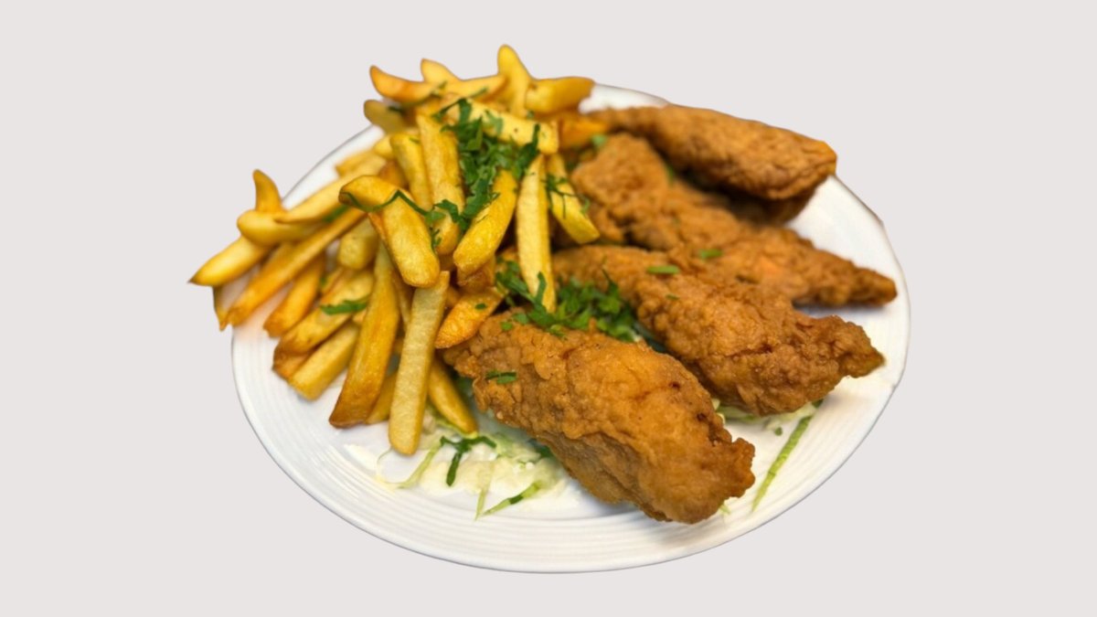 Hausgemachte crispy Chicken Filets Vier(4) StĂĽck , dazu Pommes , Hausgemachte Knoblauchsauce, und spezielle Cocktail Sauce, Salat , Brot