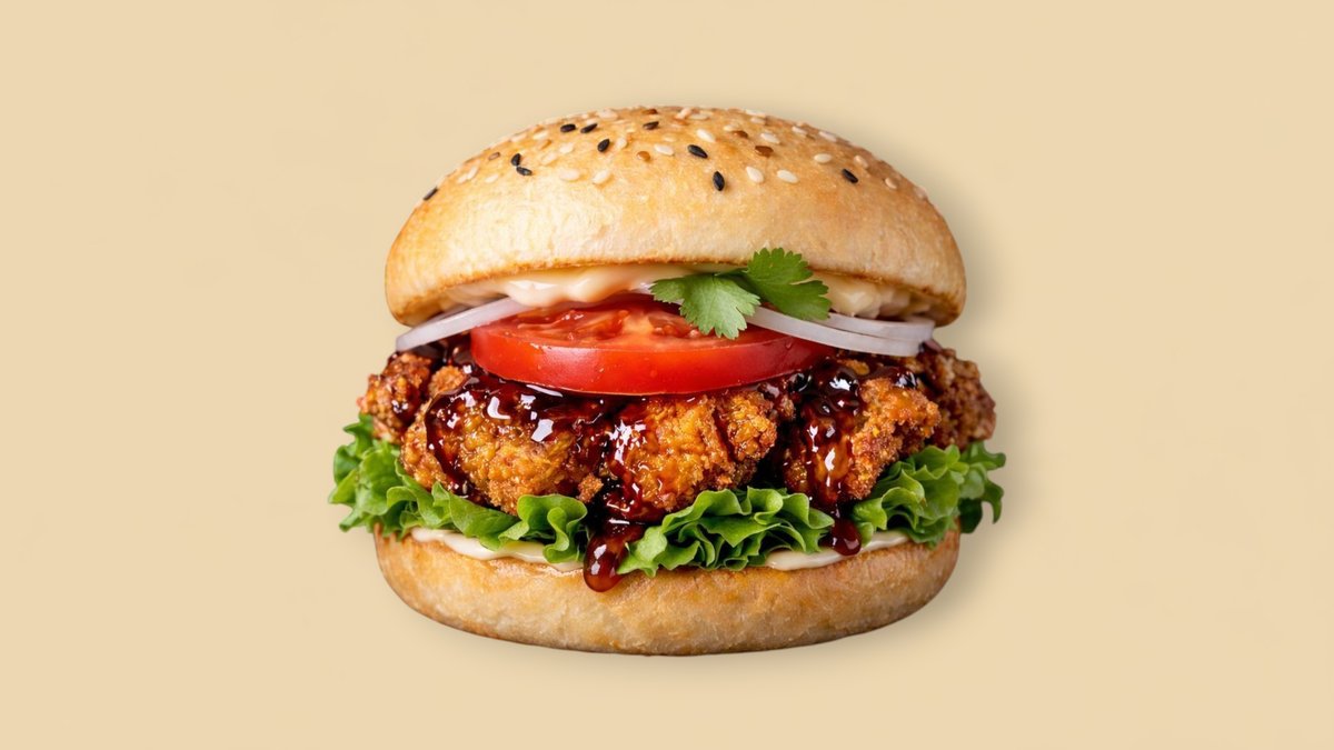 mit veganem Patty, Sauergurken, Röstzwiebeln und koreanischer Barbecuesoße