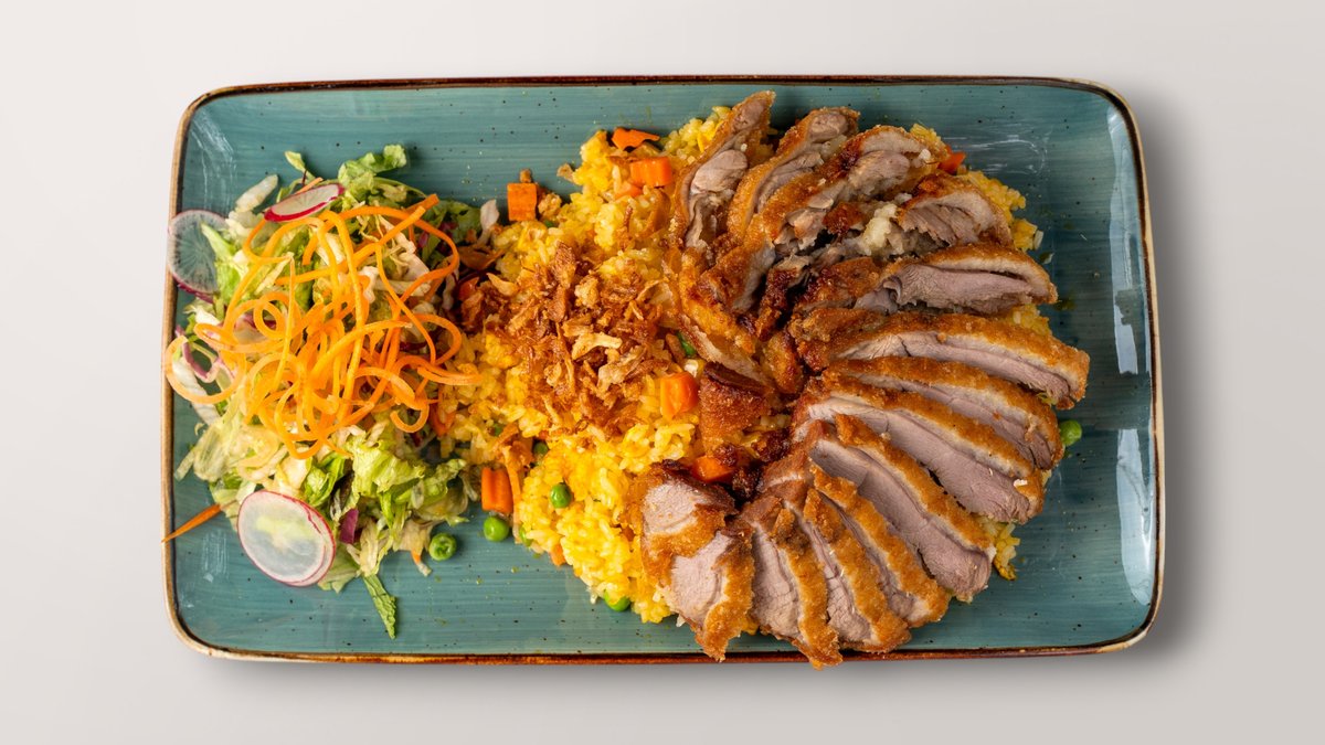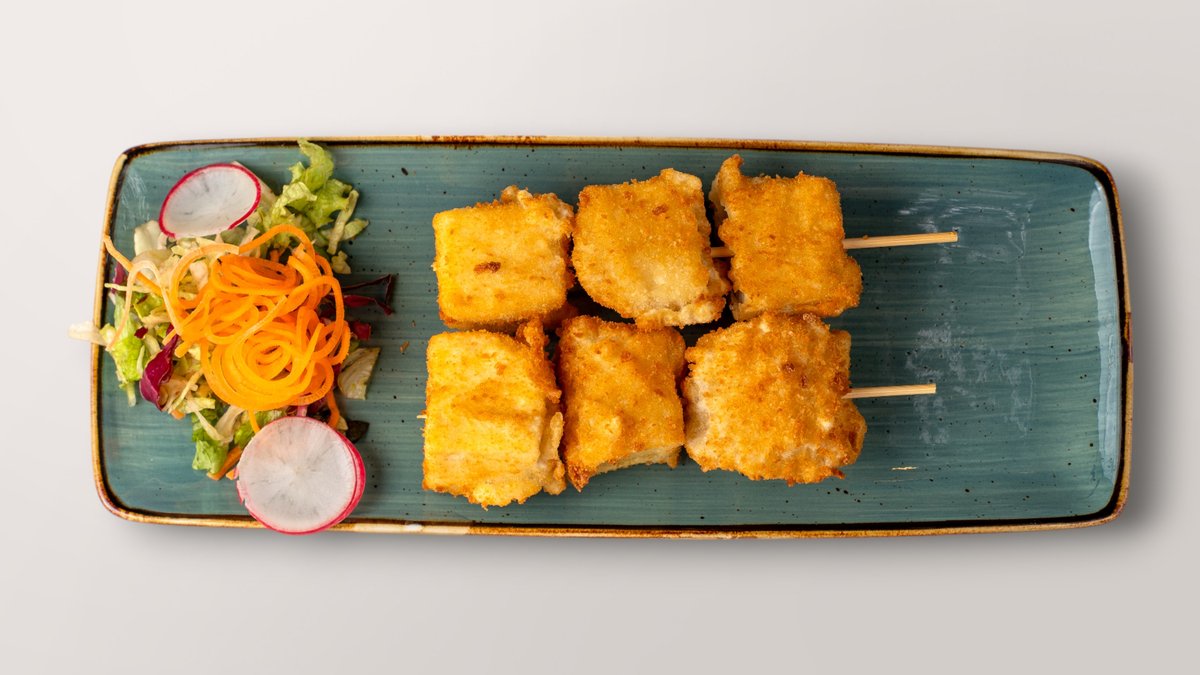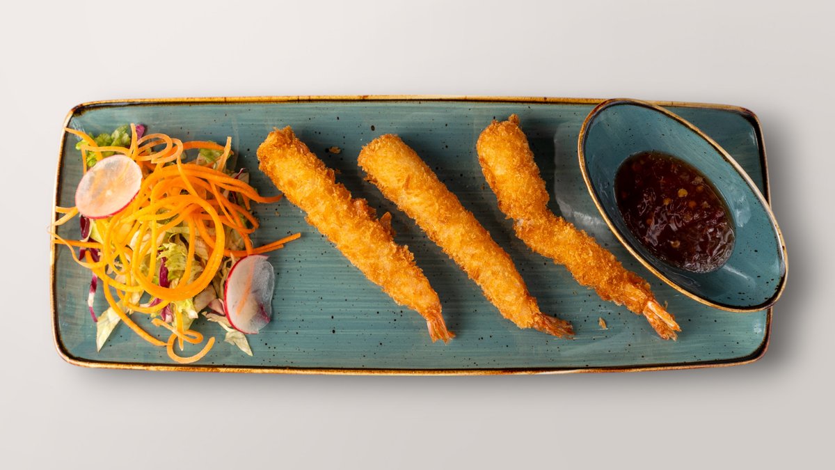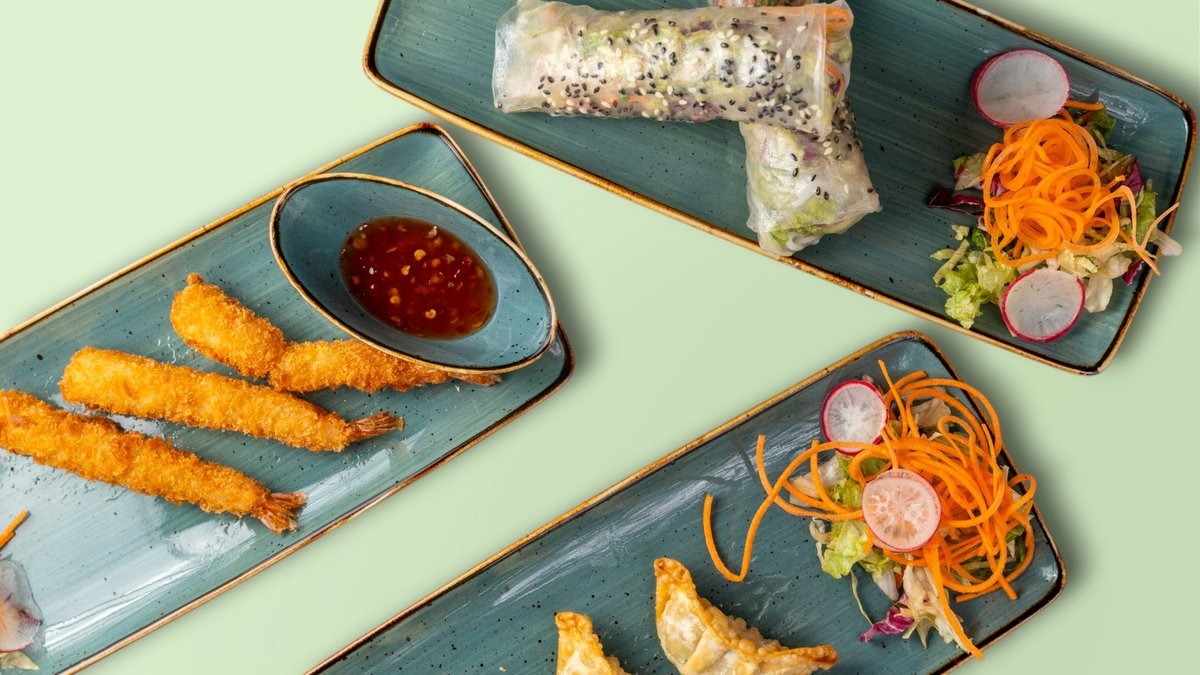 5 Stück handgefertigte Teigtaschen gefüllt mit zartem Hähnchenfleisch und Garnelen, dazu Salat und hausgemachtes Chili-Limetten-Dressing