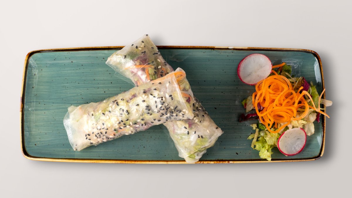 2 Stück in Reispapier mit Salat, hausgemachtem Erdnuss-Soja-Dressing und einer Zutat deiner Wahl