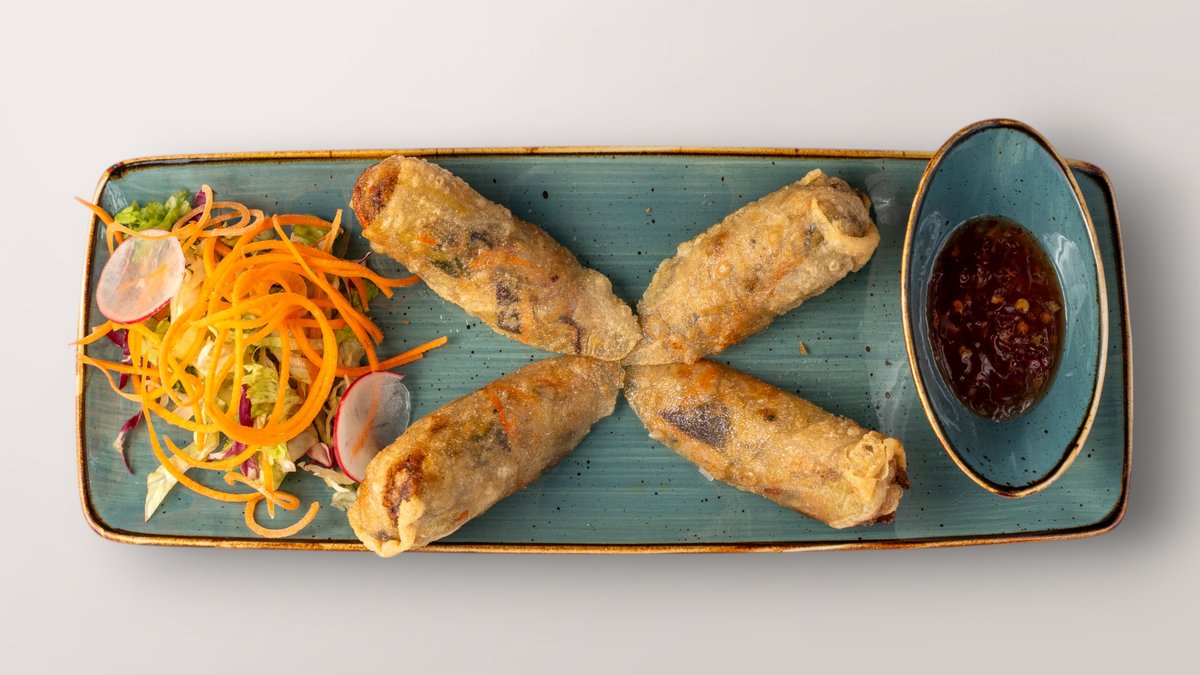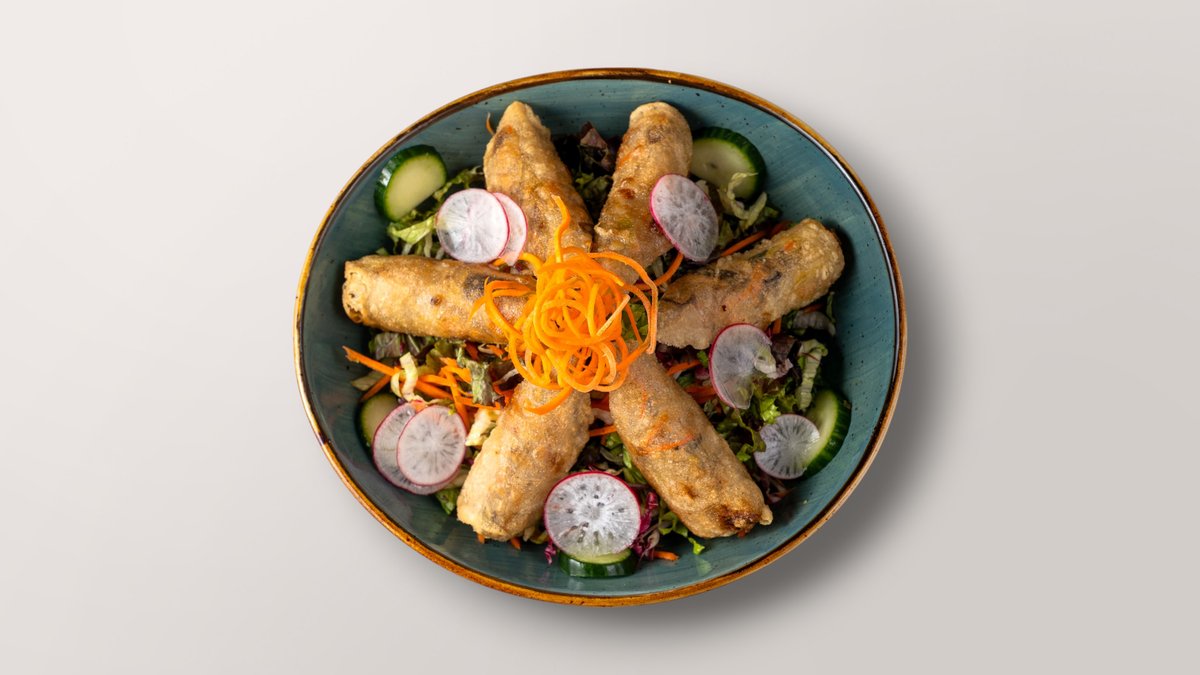 8 Stück umwickelt mit Kräutern und gefüllt mit Gemüse, dazu hausgemachtes Chili-Limetten-Dressing