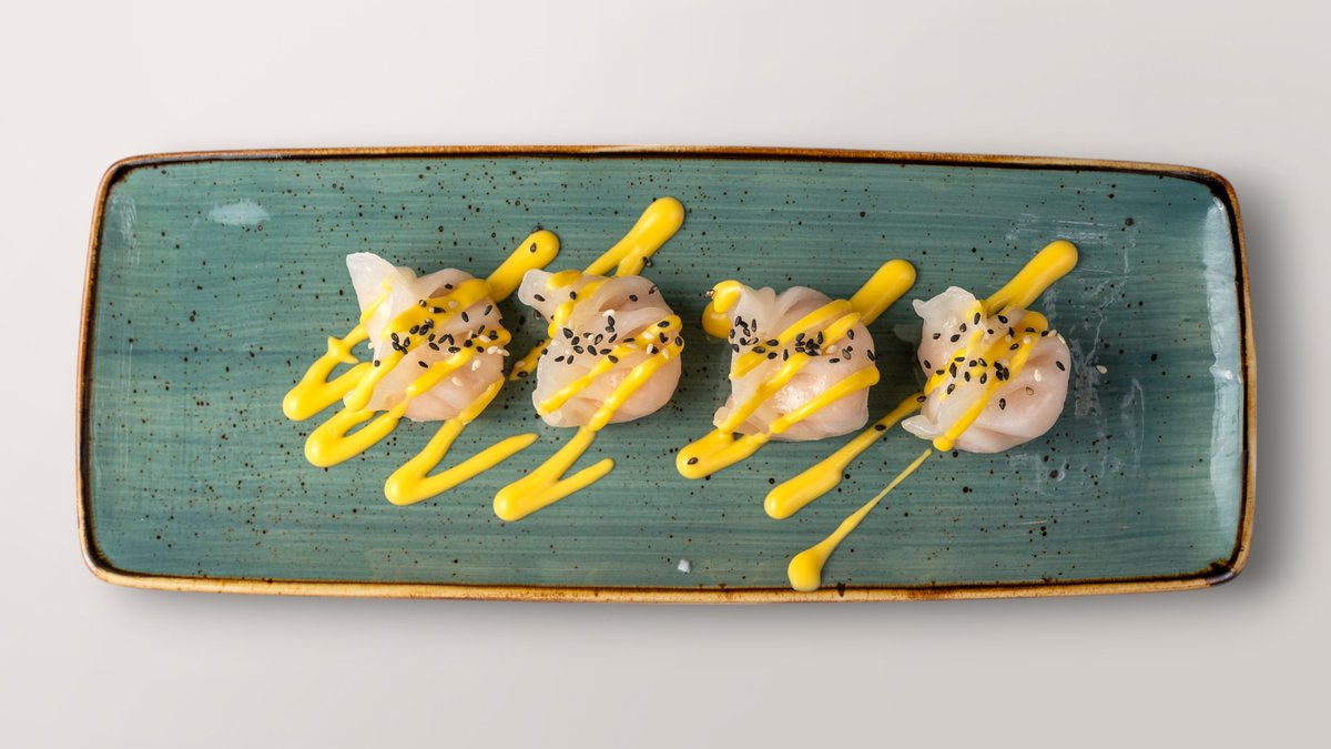 4 Stück gedämpfte Teigtaschen gefüllt mit Hähnchen und Gemüse, dazu Mango-Mayonnaise