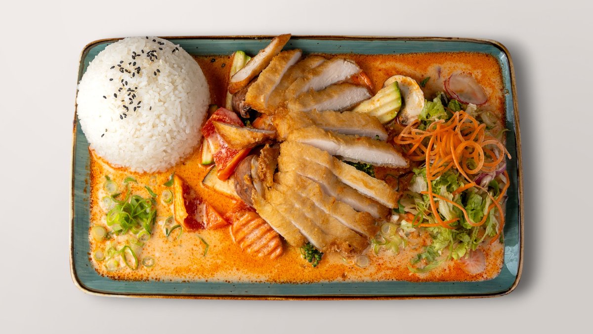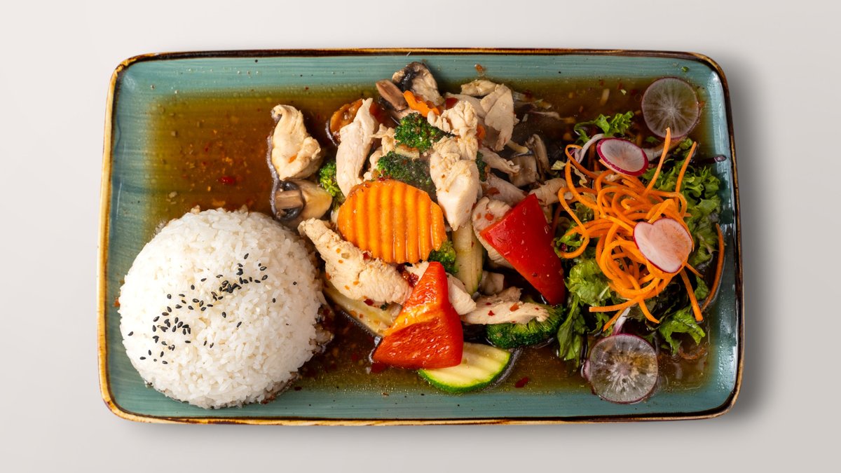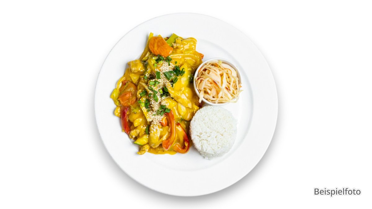 leicht scharf mit verschiedenem Gemüse aus dem Wok, mit einer Zutat deiner Wahl und Reis